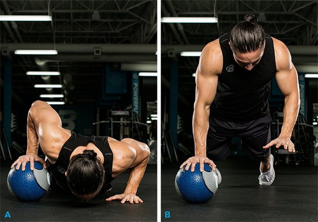 Ключевой совет от тренера. «Можете делать это упражнение на степ-платформе или с небольшим гимнастическим мячом, хотя я бы не советовал брать слишком большой мяч, — говорит Тумминелло. — С мячом отжиматься труднее, чем на степ-платформе, потому что он все время норовит выскользнуть из-под руки. Также можете поставить ноги на возвышение и тем самым еще сильнее увеличить нагрузку на мускулатуру верхней части туловища».